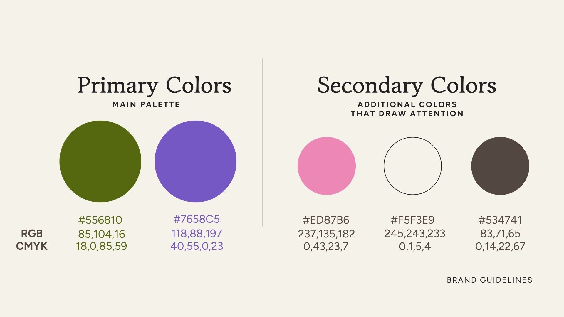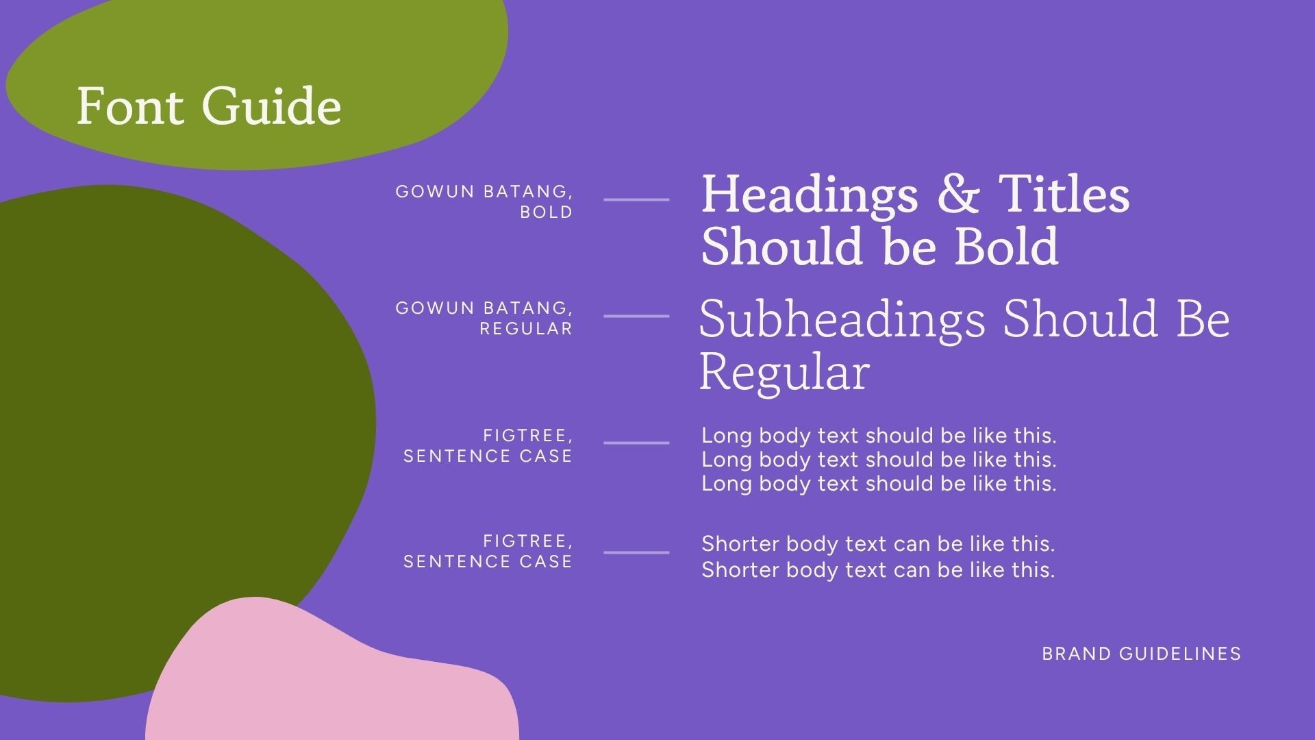 The following graphics are slides from my final brand presentation, which I completely wrote and designed to present the visual identity and brand guidelines to the founders. View the complete presentation here.
